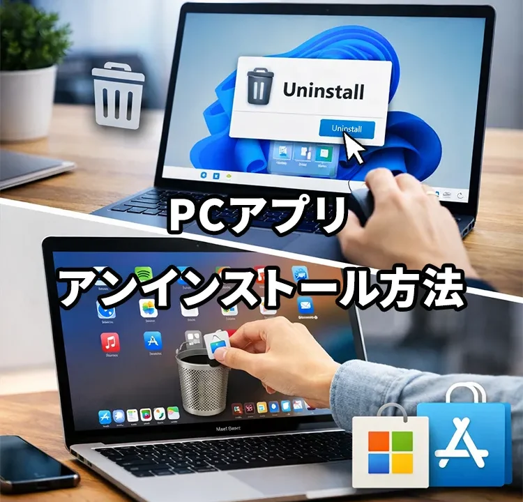 この記事では、Windows / Mac それぞれの基本手順に加え、Microsoft Store や App Store 経由のアプリのアンインストール方法まで、実用的にまとめます。